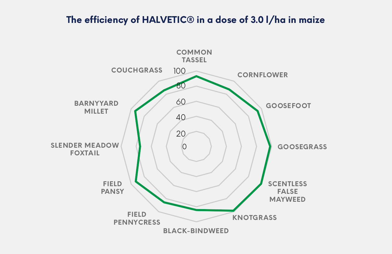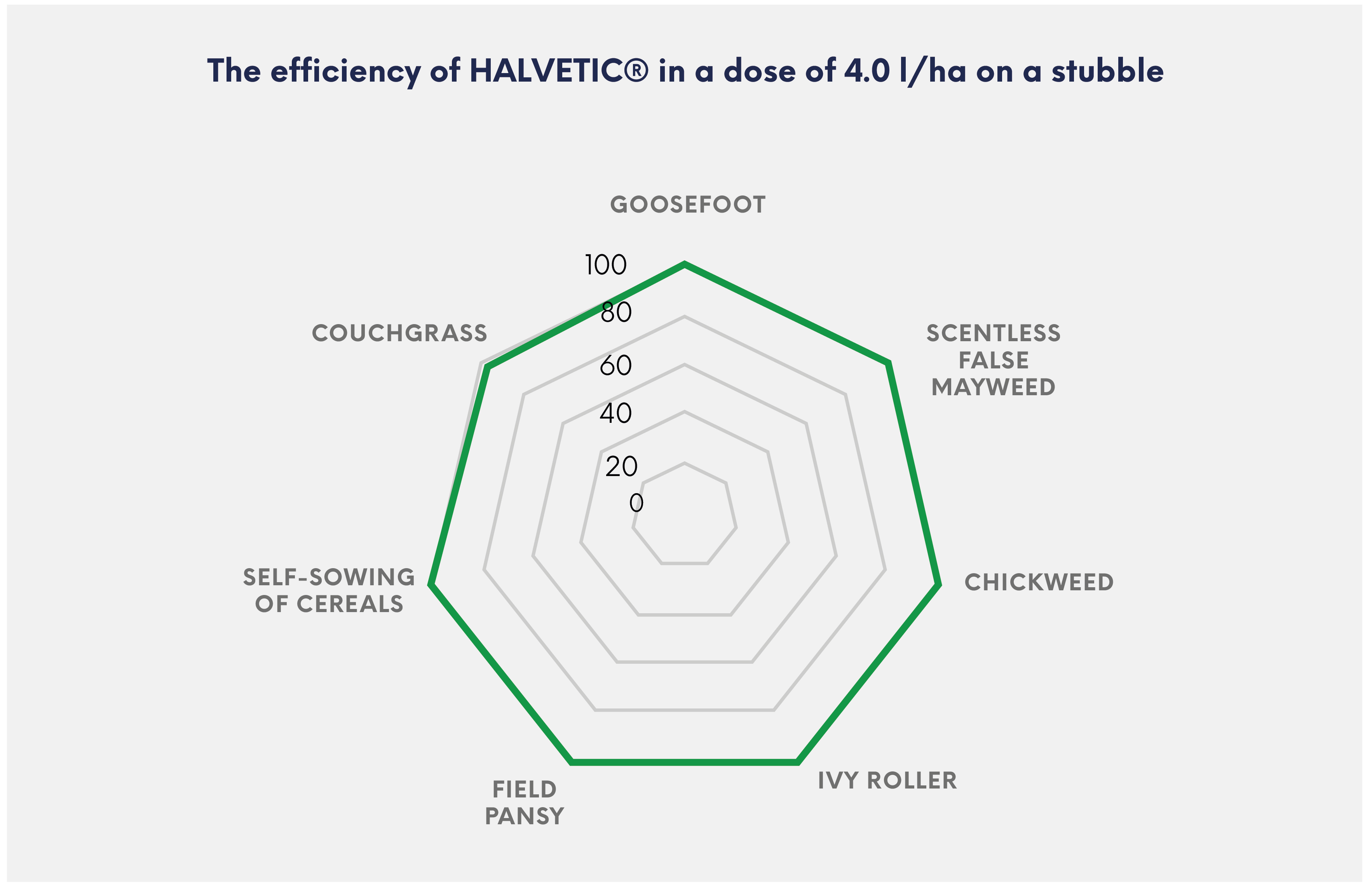High efficiency in controlling weeds: HALVETIC® provides very good efficiency in controlling weeds, as confirmed by numerous tests and assessments of the effect of the product on monocot and dicot weeds, e.g.: the couch grass, the cockspur, crop volunteers, the goosefoot, the common chickweed, the black--bindweed, and the catchweed. High efficiency in every assessment confirms the top quality of the product